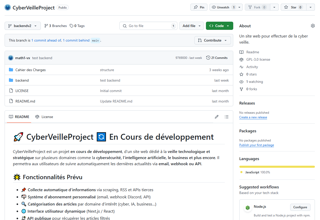 CyberVeilleProject est un projet en cours de développement, d'un site web dédié à la veille technologique et stratégique sur plusieurs domaines comme la cybersécurité, l'intelligence artificielle, le business et plus encore. Il permettra aux utilisateurs de suivre automatiquement les dernières actualités via email, webhook ou API.